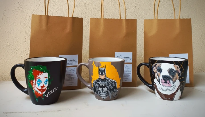 Desde entonces, María de los Ángeles ha desarrollado una faceta especial de su trabajo: las obras personalizadas y los pedidos a la medida. Tazas pintadas a mano con personajes como el Joker o Batman, retratos de mascotas, lienzos con significados únicos para quien los encarga.
